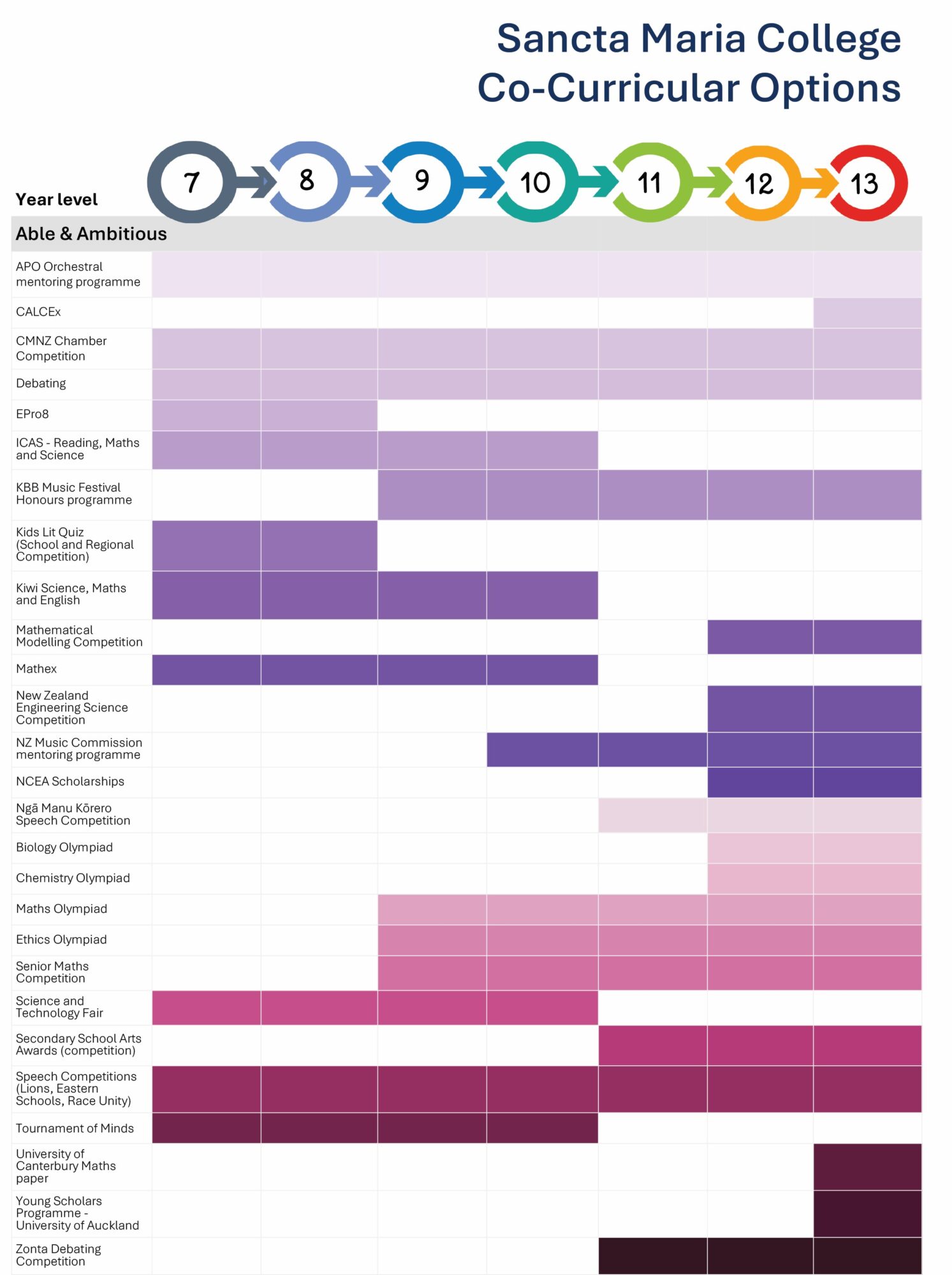 The majority of subjects at Sancta Maria College offer Scholarship options at Year 13 and some at Year 12.  In late March we will be hosting an Academic Excellence Evening for parents and students to hear about our Scholarship and Able and Ambitious programmes (these are mentioned above). Information will be on the website, social media, and by invitation.