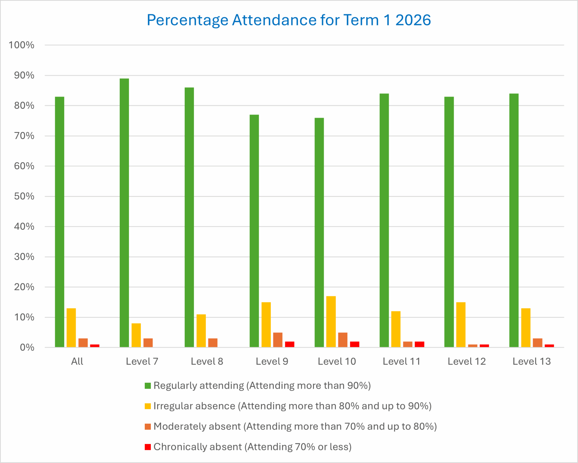 As part of the Ministry of Education’s Attendance Matters initiative, our school has set a target for every student to achieve at least 90% attendance. We’re pleased to see our Year 7 cohort leading the way, with just under 90% of students meeting this goal. At the same time, we know there is room for improvement in Year 9 and 10, where just over 75% of students are currently reaching the target.
